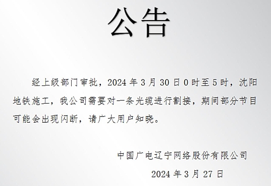 经上级部门审批,2024年3月30日0时至5时,沈阳地铁施工,我公司需要对一条光缆进行割接,期间部分节目可能会出现闪断,请广大用户知晓。