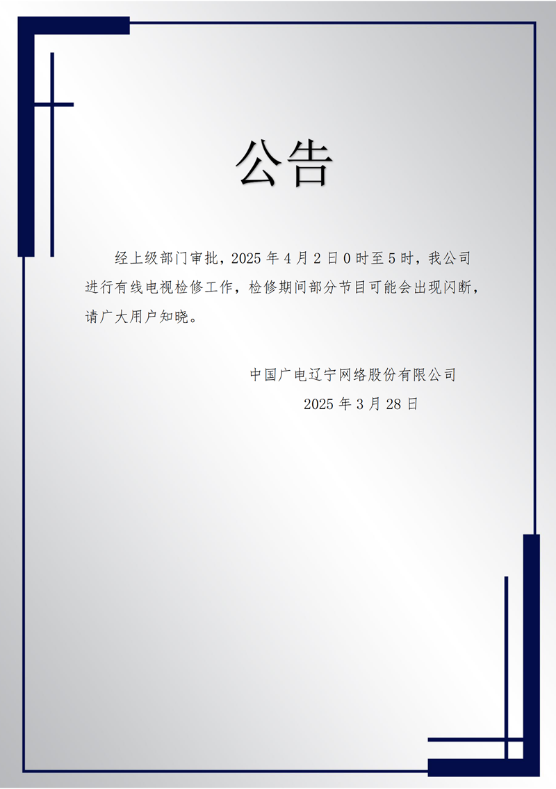 经上级部门审批,2025年4月2日0时至5时,我公司进行有线电视检修工作,检修期间部分节目可能会出现闪断,请广大用户知晓。