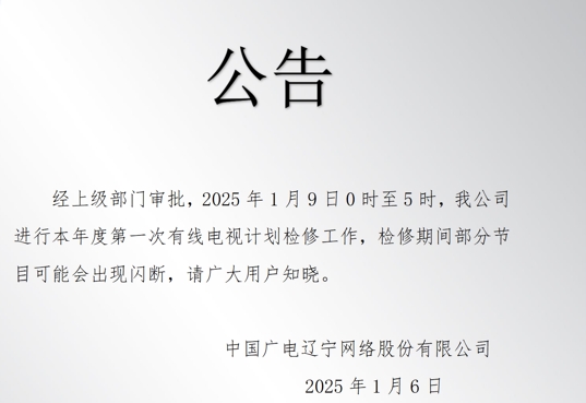 经上级部门审批,2025年1月9日0时至5时,我公司进行本年度第一次有线电视计划检修工作,检修期间部分节目可能会出现闪断,请广大用户知晓。