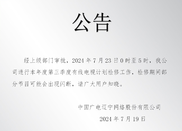 经上级部门审批,2024年7月23日0时至5时,我公司进行本年度第三季度有线电视计划检修工作,检修期间部分节目可能会出现闪断,请广大用户知晓。
