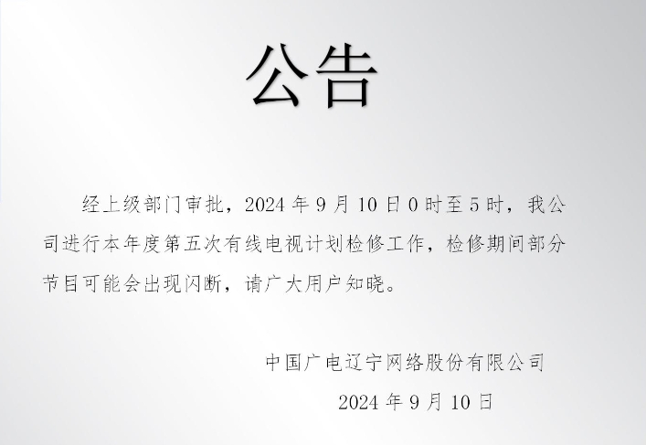 经上级部门审批,2024年9月10日0时至5时,我公司进行本年度第五次有线电视计划检修工作,检修期间部分节目可能会出现闪断,请广大用户知晓。