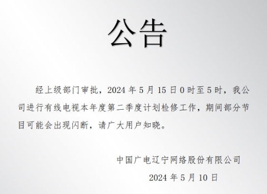 经上级部门审批,2024 年5 月15 日0 时至5 时,我公司进行有线电视本年度第二季度计划检修工作,期间部分节目可能会出现闪断,请广大用户知晓。