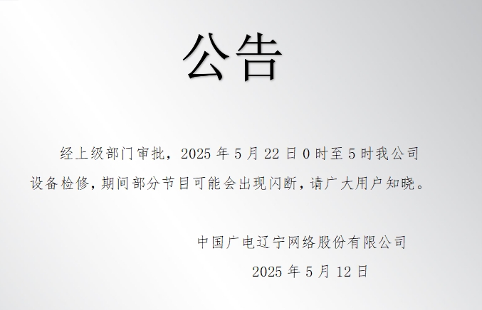 经上级部门审批,2025年5月22日0时至5时我公司设备检修,期间部分节目可能会出现闪断,请广大用户知晓。