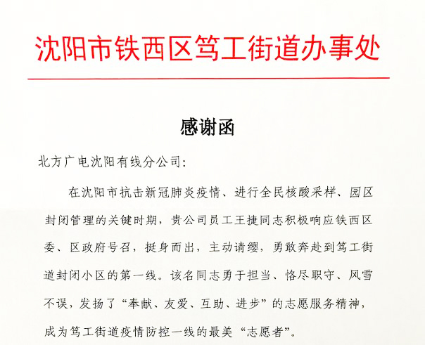 1月19日,sunbet申搏网络公司沈阳分公司接到沈阳市铁西区笃工街道发来的感谢函,对公司员工王捷同志在沈阳市抗击新冠疫情期间做出的突出贡献表示由衷的感谢。