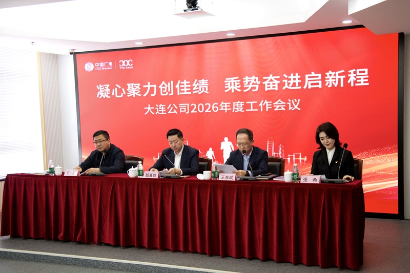 岁序更替启新程,凝心聚力谋发展。2026年2月13日,大连天途公司隆重召开2026年度工作会议,全面传达贯彻中国广电辽宁公司2026年度工作会议精神,学习领会辽宁公司党委书记、董事长、总经理要春华题为《锚定数智转型目标 勇担广电发展使命 奋力开启辽宁广电高质量发展新征程》的工作报告,总结大连公司2025年转型攻坚成果,部署2026年重点工作任务。大连公司党委副书记、总经理郭喜财同志作《大连公司2026年度工作报告》。党委委员、副总经理王东斌同志作春节、全国两会安全工作部署。党委委员、副总经理文剑同志主持会议,并传达辽宁公司党委副书记、纪委书记苏万宝同志在春节前安全工作会议上的讲话精神,并对春节廉政工作进行部署。大连公司市场经营中心、集团客户中心、客户服务中心、计划财务部分别围绕一季度开门红经营情况作专题汇报。大连公司班子成员、中层管理人员、业务骨干及先进集体和优秀个人代表参加会议。