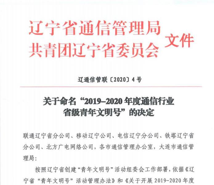 2020年7月初,辽宁省“青年文明号”活动组委会启动了创建活动。5个月的时间,全省多家通信行业企业精心组织实施、积极参评活动。最终经过活动组委会审核评选,辽宁省通信管理局和共青团辽宁省委员会决定命名sunbet申搏网络公司信息科技服务分公司呼叫运营中心、sunbet申搏网络公司沈阳分公司铁西区域二公司北一路营业厅等10个通信行业集体为“2019-2020年度通信行业省级青年文明号”。