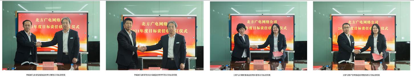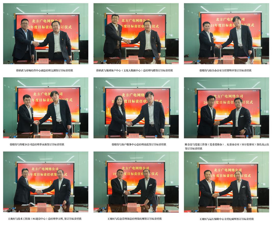 会上,公司党委书记、董事长、总经理曾绍武分别与市场经营中心、集团客户中心(文化大数据中心)签订目标责任状;公司党委委员、副总经理张晓钧分别与综合办公室、物业安保部、传媒分公司、客户服务中心签订目标责任状;公司党委委员、纪委书记、工会负责人陈金宏分别与党建工作部(党委巡察办)、人力资源部、纪委办公室(审计监察部)签订目标责任状;公司党委委员、总工程师王兆恒分别与技术工程部(5G建设中心)、信息管理部、运行保障中心签订目标责任状。