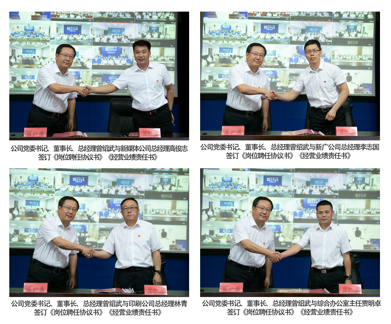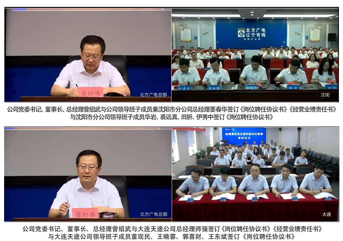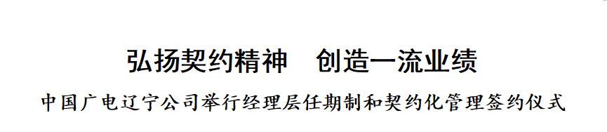2021年8月25日,中国广电辽宁网络股份有限公司(简称中国广电辽宁公司)经理层成员任期制和契约化管理签约仪式采取云视频签约方式在公司总部主会场和各市分(子)公司分会场成功举行。首批签约人员涵盖了省公司总经理、副总经理、总工程师、班子成员、总经理助理、职能部门总经理、副总经理以及分(子)公司总经理、副总经理共计99人。公司党委书记、董事长、总经理曾绍武出席签约仪式,纪委书记陈金宏主持签约仪式。