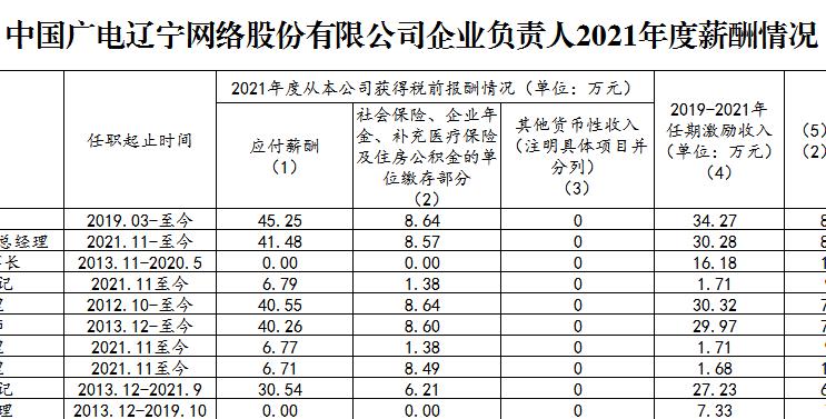 中国广电辽宁公司2021年企业负责人薪酬公示