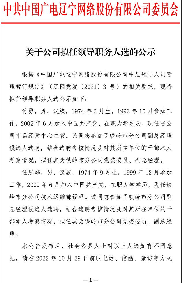 根据《中国广电辽宁网络股份有限公司中层领导人员管理暂行规定》(辽网党发[2021]3号)的相关要求,现将拟任领导职务人选公示如下: