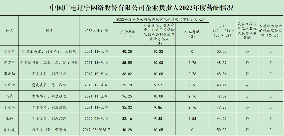 中国广电辽宁网络股份有限公司企业负责人2022年度薪酬情况