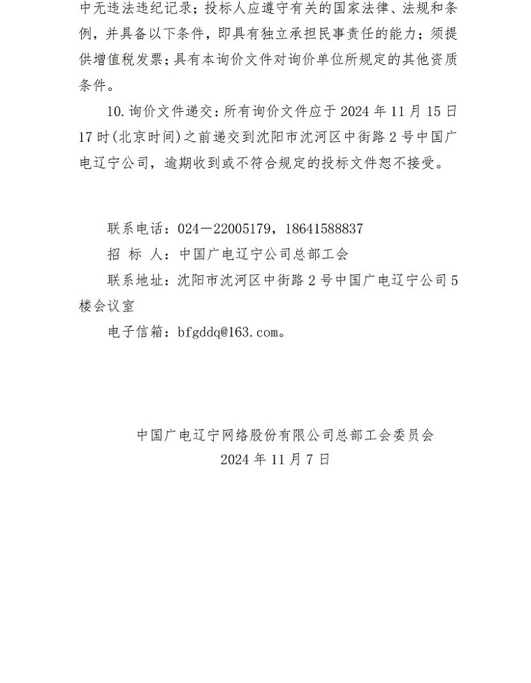 中国广电辽宁网络股份有限公司总部工会购买“中秋、国庆节慰问品”的询价公告