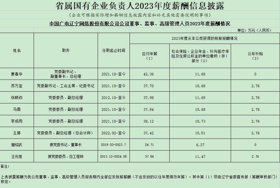 中国广电辽宁网络股份有限公司公司董事、监事、高级管理人员2023年度薪酬情况