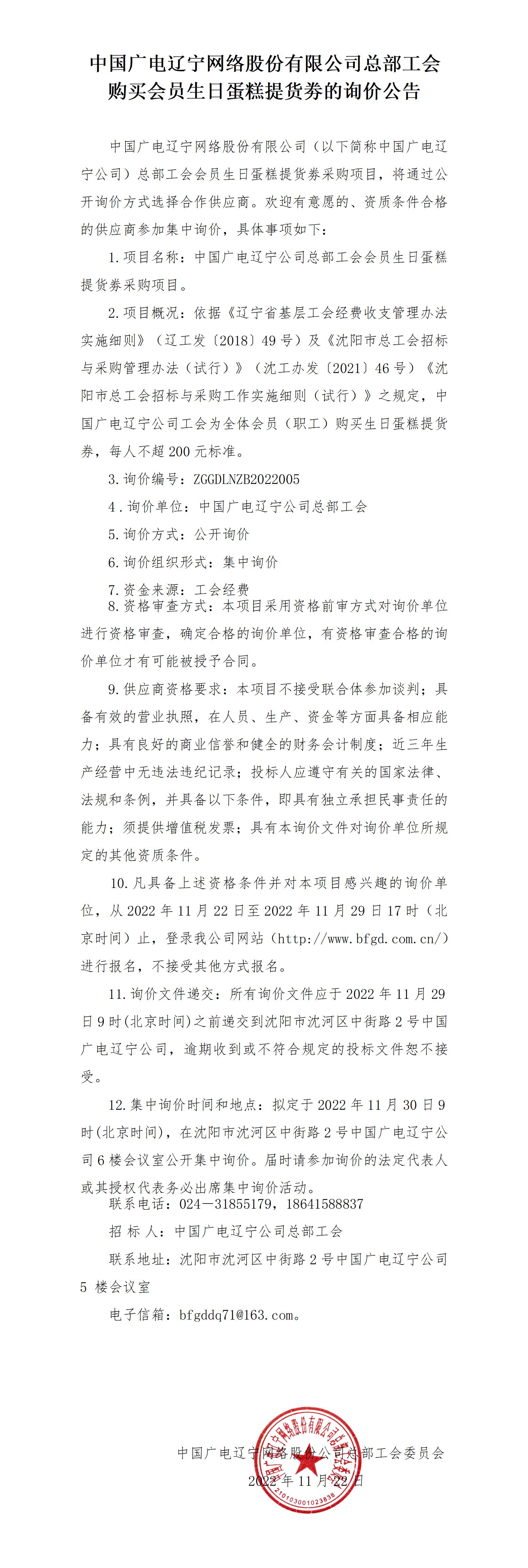 中国广电辽宁网络股份有限公司总部工会购买“2023年会员生日蛋糕提货券”的询价公告