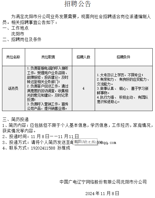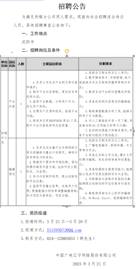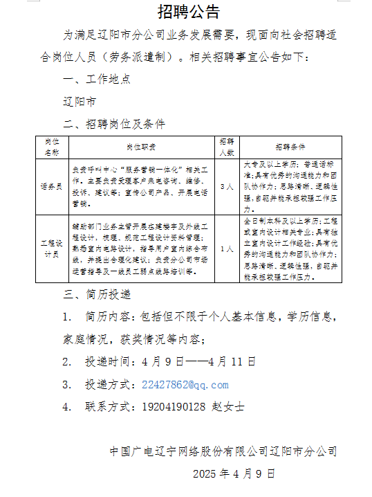 为拓展公司政企业务,加强集团客户中心(文化大数据中心)人才队伍建设,现面向社会招聘适合岗位人员。具体招聘事宜公告如下: